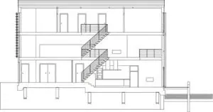 De achtergevel bestaat uit vier grote schuifluiken met regelbare, rechthoekige lamellen. Aan deze zijde bevindt zich de fotostudio, zodat regeling van daglicht hier extra belangrijk is. Bovendien zorgt een vide voor een maximale daglichttoetreding bij een open stand van de luiken. Daarnaast levert de vide een fraai ruimtelijk effect op.