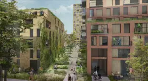 Lyppens schrijft: Stadswijken in wording, zoals Overhoeks in Amsterdam en Merwede in Utrecht, zetten zich met mooie beelden in de markt als ‘Het wonen van de toekomst’. Hierbij wordt de collectieve tussenruimte in de vorm van autovrije vergroende straten, pleinen en binnengebieden ingezet als compensatie voor de beperkte woonruimte. Daar is op zich niks mis mee. Mits ze goed zijn ontworpen.