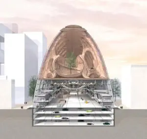 Ondanks de gescheiden werelden, zijn dit niet twee verschillende gebouwen op elkaar. Op technisch vlak werkt het gebouw juist als één organisme, profiteren de functies van elkaar of werken ze samen. Allereerst het klimaatsysteem. Beide functies hebben veel ventilatie nodig. Het ventilatieprincipe is gebaseerd op een zogenaamde windtoren: een opening hoog in het gebouw zorgt voor onderdruk die leidt tot passieve afzuiging van lucht. De ventilatieschachten zijn geïntegreerd in de constructie, en zijn bepalend voor de architectonische uitstraling van het ontwerp dat beide werelden juist bindt. De windtoren vervangt de iconische kerktoren en fabrieksschoorsteen en voegt hieraan een nieuwe functionele betekenis toe. Voor de verwarming van het gebouw wordt de hitte van de machines in de fabriek gebruikt, en de inkomende lucht wordt verwarmd met behulp van de stabiele bodemtemperatuur. Het gebouw wordt gekoeld met water uit Lake Michigan. Dit principe wordt gecombineerd met principe van de double skin facade, die het gebouw in de zomer afkoelt. De binnenste schil van zo’n façade hoeft slechts enkelglas te zijn, maar wel zonwerend. Dit is in het gebouw gecombineerd met een glas-in- loodpatroon met gekleurd glas, die te veel zon tegenhoudt maar tegelijkertijd een esthetische functie heeft. Ook op constructief vlak werken de twee werelden samen. De houten spanten van de kerk, die bestaat uit plakjes gelaserd cross laminated wood, worden in de fabriekshal beneden geproduceerd. Door de grote vormvrijheid die deze techniek biedt, is het mogelijk de kerk een bijzondere architectonische uitstraling te geven. Zodra de kerk af is, kan de fabriek doorgaan met het produceren van deze spanten, en is het mogelijk ze via Lake Michigan te verschepen. Zo kunnen er in de toekomst méér (mega)kerken gebouwd worden in de VS die niet lijken op grote winkelcentra, maar de bijzondere spirituele uitstraling kunnen krijgen die ze verdienen.