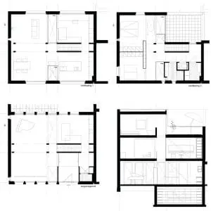 Gevarieerd werd het zeker in de Poststraat. Ad Smeulders die tot 2008 architect was bij luijten|smeulders|architecten in Tilburg en sindsdien als adsmeuldersarchitect advieswerk en haalbaarheidsonderzoeken doet, en zijn buren Peer en Tonny Bedaux – hij is toevallig ook architect – kochten samen het perceel. Het was één aanbesteding met één aannemer. Op een aantal restricties na, zoals de bouwhoogte en de plicht tot het parkeren van de auto op het eigen terrein, konden ze doen wat ze wensten. Het leverde twee moderne 11 meter, 11 centimeter en 2 millimeter brede stadshuizen op, maar wel twee totaal verschillende. Alleen al het tekenen van een eigen huis leverde Ad veel plezier op. Hij schetste vier bouwlagen met een heldere, in twee richtingen symmetrische plattegrond (5).