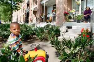 2. Renovatie Zuidwijk Rotterdam. Subtiele transformatie van wederopbouw-architectuur door Locus architecten. De onderste maisonnettes kregen een eigen toegang vanaf de straat, ze werden voorheen ontsloten door een galerij. We zien hoe een kleuter profiteert van de nieuwe situatie: hij kan nu veilig op straat spelen, vanaf de nieuwe veranda houdt oma een oogje in het zeil.