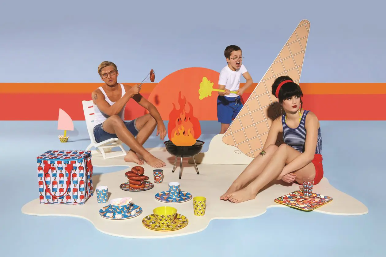Studio Job heeft speciaal voor de HEMA de zomercollectie ‘Summer Disaster’ ontworpen. Het designlabel combineert functionaliteit met conceptueel design en komische prints.De collectie is geïnspireerd op de bloopers van de zomer. Denk hierbij aan té hete temperaturen, smeltende ijsjes en wespen en muggen. Studio Job heeft met een creatieve twist al deze elementen gecombineerd in kleurrijke en typische ‘Studio Job-printen’ om zo een collectie te ontwerpen bestaande uit 2 thema’s: Eating Outside en Beach Life.