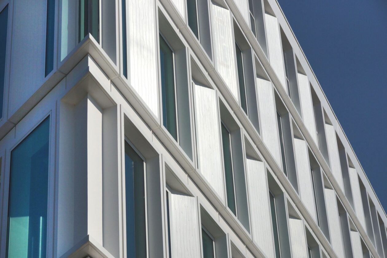Architect Marlies Rohmer ontwierp een paar jaar geleden een spectaculaire (witte) cassettegevel van composiet voor brede school De Matrix in Hardenberg. Al snel bleek dat vooral de liggende delen van de panelen snel en zichtbaar vies worden, zodat de school er tegenwoordig een paar keer per jaar de hogedrukspuit op moet laten zetten en er extra kosten moeten worden gemaakt. Als fabrikant benadrukken ze dat aspect altijd, zegt Stefan Smit van Polux, dat de panelen voor Hardenberg produceerde. ‘Een nanocoating (Proseal) erop scheelt al veel. Dat doen we nu op de panelen van het stadskantoor in Utrecht. Die zijn bovendien nog afgeschuind zodat vuil er niet snel op blijft zitten. Maar het gaat wel om een witte gevel in hartje Utrecht bovenop het station en tussen drukke wegen.’