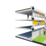Composiet werd ‘groot’ in de lucht- en ruimtevaartwereld en is nog steeds hét materiaal voor de bouw van snelle (zeil)jachten, een branche waar Holland Composites ook actief in is. Zo’n tien jaar geleden kwam vanuit de productiehallen in Lelystad een grote innovatie: spaceboxen, prefab kunststofcabines voor studentenhuisvesting. Daarna onderzocht het bedrijf samen met architectenbureaus als Rudy Uytenhaak en Broekbakema, naar de mogelijkheid om composiet intensiever toe te passen in de architectuur. Van Riemsdijk: ‘Niet als een voorzetplaatje, maar als materiaal om een constructieve gevel mee te maken. Een sandwichelement. Een pakket van een buitenplaat, een isolerend kernmateriaal en een binnenplaat. Waarbij de sterkte wordt bepaald door de mix van materialen die je kiest. Wat dat betreft is het vergelijkbaar met koken. Je kunt met veel verschillende elementen werken en je eigen constructiemateriaal maken.’