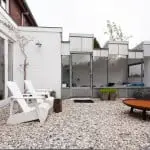 De voorgevel aan het Spaarne refereert slechts aan een pakhuis. Dus iets minder Meat Packing District en iets meer Nederlandse nieuwbouw. In het midden zit een verticale knip van glas, de entreezones van de appartementen, die ’s avonds opvallend oplichten. “Deze knip zorgt bovendien voor een relatie met de kleinere schaal van naastgelegen panden, net als de zijgevel die wordt doorsneden door twee volumes met woningen.”