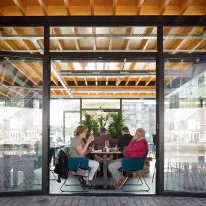 Om de openbare ruimte te vergroten, bedachten de bureaus een vrij toegankelijk dakterras over de breedte van de pier dat deels het restaurant en de kade overdekt. Lebbink: ‘Boven heb je dan een mooi uitzicht over de haven en onder is een schuilplek voor de regen. De toegangstrap en verplichte veiligheidsmaatregelen maakten het ontwerp wel een stuk ambitieuzer dan het programma van eisen. Maar toevallig sloot de gecombineerde publieke en private functie goed aan bij de gemeenteplannen voor een aankomstpaviljoen in het gebied. De jury koos daarom voor ons ontwerp, waarna de gemeente als mede-ontwikkelaar instapte. Alles wat bovenop zit is haar eigendom en door haar gefinancierd.’
