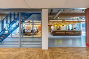 Om de overzichtelijkheid te vergroten is de indeling van de vijf bovenliggende verdiepingen min of meer identiek. “Wel heeft elke verdieping zijn eigen kleursysteem, variërend van mosterdgeel tot junglegroen. Deze verf is geheel op natuurlijke basis. Gebruik van gezonde materialen is een vast uitgangpunt van Studio Valkenier.” Om de indeling van de werkvloer zo helder mogelijk te houden zijn vaste functies als wc’s en kopieermachines tegen de harde kern rond de lift geplaatst. Deze is gemarkeerd met een lattenwand. Elke verdieping heeft een vaste plek voor de pantry, tegenover de trap zodat je er nooit naar hoeft te zoeken. Ook zijn er veel vergaderruimtes, stilteplekken om te bellen en informele zithoekjes. “De individuele werkplekken zijn daardoor rustig