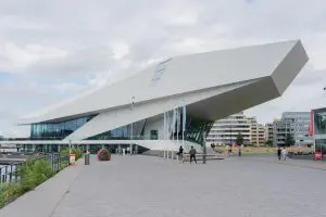 Niets lijkt parallel in het architectonische lijnenspel en toch is er structuur en samenhang. Het lichte, beperkte kleur- en materiaalpallet is net zo consequent doorgevoerd als het spelen met schuine lijnen en vlakken. Het gebouw gaat een spannende relatie aan met de omgeving. Binnen en buiten lopen soepel in elkaar over. ‘Vloeiende, functioneel gedefinieerde ruimtelijke sequenties’, zoals de architecten het zelf formuleren. De verbinding met het weer en het water zijn alom aanwezig. Van binnenuit heb je prachtig uitzicht op de binnenstad van Amsterdam aan de overkant. De centrale ruimte brengt daarnaast ook diverse publieksfuncties bij elkaar. Hierdoor ontstaat een soort levendig plein. Ergens las ik dat het gebouw aan de binnenkant is begonnen doordat de architect een stuk papier tot een soort kuip vormde. Deze intieme kom vormde de basis voor