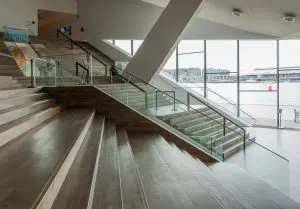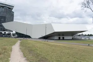 Niets lijkt parallel in het architectonische lijnenspel en toch is er structuur en samenhang. Het lichte, beperkte kleur- en materiaalpallet is net zo consequent doorgevoerd als het spelen met schuine lijnen en vlakken. Het gebouw gaat een spannende relatie aan met de omgeving. Binnen en buiten lopen soepel in elkaar over. ‘Vloeiende, functioneel gedefinieerde ruimtelijke sequenties’, zoals de architecten het zelf formuleren. De verbinding met het weer en het water zijn alom aanwezig. Van binnenuit heb je prachtig uitzicht op de binnenstad van Amsterdam aan de overkant. De centrale ruimte brengt daarnaast ook diverse publieksfuncties bij elkaar. Hierdoor ontstaat een soort levendig plein. Ergens las ik dat het gebouw aan de binnenkant is begonnen doordat de architect een stuk papier tot een soort kuip vormde. Deze intieme kom vormde de basis voor