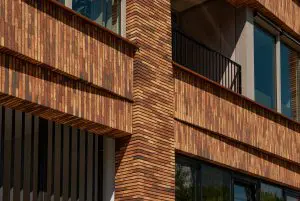 Twee appartementengebouwen in Amsterdam, beide duurzaam, twee CPO-projecten en allebei voorzien van steenstrips. En toch zijn de houthavens en WFC My loft niet vergelijkbaar. Anton: “In de houthavens moest steigerloos gebouwd worden en is alles geprefabriceerd. Ook alle gevelelementen van 3 x 8 meter. Dat is een beduidend andere manier van werken. Niet alleen voor de bouwer, ook voor ons. Bij prefab moet je zorgen dat afstanden telkens hetzelfde zijn, ook als er overhoeks twee elementen aan elkaar geplaatst worden. Dat vraagt om discipline en aan de voorkant nadenken over de bouwpraktijk. daarnaast is de twee procent bouwtolerantie – die in het verleden aangehouden werd – achterhaald. als je niet oppast heb je naast een prefab element van 8 meter een naad van 16 centimeter. Dat ziet iedereen.” Bovendien is prefabricage niet altijd de uitkomst, blijkt als Carla verder praat. “In prefabfabrieken zie je hoe exact materialen verwerkt worden, maar op de bouw is nog niet iedereen daarop ingesteld. soms wringt dat. Daarnaast is de vorm bepalend. Bij My Loft kozen we voor verwerking van de minerale steenstrips op de bouwplaats. Dat ging prima omdat er voldoende ruimte was voor steigers. Het had ook onze voorkeur, omdat de gevel golvend is en een creatief patroon de façade siert.”