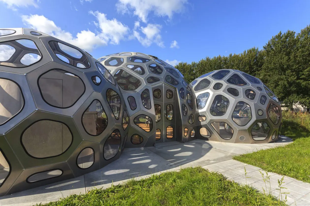 Een werk dat het midden houdt tussen kunst en architectuur is het paviljoen WaterBar op de WaterCampus in Leeuwarden opgetrokken uit 300 unieke aluminium panelen. Het ontwerp van kunstenaars Gerard Groenewoud en Tilly Buij heeft de vorm van een H2O molecuul: het grote zuurstofatoom biedt plaats aan groepen bezoekers, een waterstofatoom herbergt een keuken/ bar en het andere een ecotoilet. Groenewoud: “Ik ging met ons idee eerst naar Theunis Bakker, om te bedenken hoe het uitgevoerd zou kunnen worden en om een begroting te maken. Op basis van de Spaceplates bouwmethode – ontwikkeld door het Deense vormgeverscollectief N55 en Anne Romme – creëren we met facetten drie geschakelde dubbelgekromde ruimtes zonder constructief skelet. De gebogen vlakken zijn opgedeeld in een Voronoi diagram, de verdeling van druk bepaalt het patroon. De facetten hebben elk 6 of 7 hoeken. Waar ik met Mannen van Staal veel denkwerk in heb zitten, is de bepaling van de zethoek voor alle randen, zodat die na montage perfect op elkaar aansluiten. Per flens is in de lasergesneden panelen een codering aangebracht met het paneelnummer, de zethoek en het tegenoverliggende paneelnummer. Het zetwerk ging met de hand, een precisiewerk dat enkele weken in beslag nam. Met 15.000 boutjes is de puzzel op locatie in 2,5 dag in elkaar gezet.” Het paviljoen is demontabel en staat sinds 2018 op de Watercampus. Bakker: “Ik hoop dat we de Waterbar ooit nog eens bij ons bedrijf kunnen remonteren.”