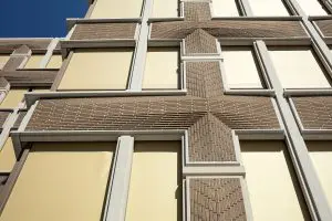 Het patroon van de baksteenstrips onderstreept de niet-dragende functie van de prefab delen en herinterpreteert volgens projectarchitect Matthias Haber op een spannende manier de baksteenarchitectuur van de historische bebouwing in de omgeving. „Als het gaat om gebouwgevels is baksteen een vertrouwd materiaal. Dit materiaal wekt, ook in de ongewone toepassing in dit project, een atmosfeer van terloopse vertrouwdheid op“, aldus Matthias Haber.
