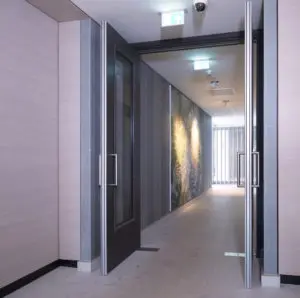 Naast de keuken zijn er op meerdere locaties in het hotel deurnaalden toegepast. Links van de in vlammend marmer opgetrokken entree bevinden zich de vergaderruimtes. Ook hier werd voor een maatwerkoplossing gekozen. De Vette over het deurtype. “Bij de vergaderzaal zijn aanslagdeuren geplaatst. Bij calamiteiten kunnen er bij een enkele deur zestig tot zeventig personen naar buiten. Door beide deuren open te zetten, kun je dit aantal verdubbelen. Ook hier is de brandwerendheid 60 minuten.” Bij het wellness center en de fitnessruimte op de twaalfde verdieping viel de keuze op pendeldeuren. Dit heeft als belangrijk voordeel het gebruiksgemak. In tegenstelling tot een aanslagdeur heb je hier niet met een sluitvolgorde te maken. “Dat is bijzonder geschikt voor een ruimte waar veel mensen doorheen moeten,” vult De Vette aan.
