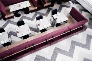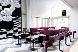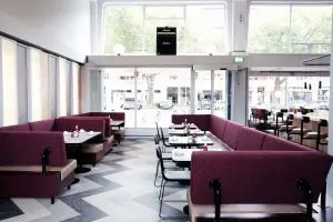 Het restaurant By Jarmusch in het Industriegebouw aan de Goudsesingel in Rotterdam is een combinatie van Amerikaanse cultuur, jaren vijftig stijl en een knipoog naar de architect Huig Maaskant. In details in het interieur zoals de vorm van de 2o meter lange bar, de bordeauxrode ‘booths’, en de zwarte lampen zie je de stijl van de architect terug. De zigzagvloer van duurzaam marmoleum Modular van Forbo Flooring refereert aan de jaren waarin Huig Maaskant actief was.