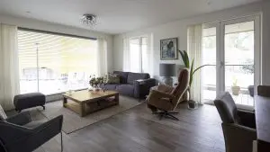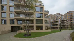 “De woonkamers hebben we voorzien van brede verdiepingshoge ramen die onbelemmerd en ruim zicht geven op de omgeving. Onze inspiratie hiervoor is Haus Lange in Krefeld van Mies van der Rohe, met zijn prachtige grote vensters.” De ramen zijn circa 2,4 meter hoog en 3,5 meter breed, op enkele plaatsen zijn de ramen tot 5 meter breed. Daarnaast zijn er aan de woonkamer openslaande deuren naar ruime balkons en terrassen. de balkons steken niet uit de gevel, maar zijn uit het volume gesneden, de lage metselwerk balustrades vormen een verlengde van de gevels. Deze geprefabriceerde balustrades zijn uitgevoerd in staand metselwerk. Daartussen bevinden zich de in het werk gemetselde penanten, in liggend metselwerk, en de aluminium kozijnen. “De aluminium ramen komen overal in de gevel voor maar moeten op diverse plekken wel aan verschillende randvoorwaarden voldoen, zoals geschikt voor triple-glas, doorvalveilig en plaatselijk ook brandwerend. onze wens was dat de kozijnen er wel hetzelfde uit zouden zien, overal met relatief smalle profielen. dat is goed gelukt.” De appartementen op de bovenste twee lagen zijn daar, waar geen terrassen of balkons zijn, voorzien van kozijnen met brede dubbele draaikiepramen, zodat bewassing van de ramen geheel van binnenuit mogelijk is. “Deze draai(kiep)ramen voor de bewassing hebben ook grote afmetingen, passend bij de overige grote ramen, precies wat we wilden”, verzekert de architect.