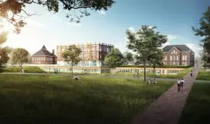 In het ontwerp zijn de gebouwen sterk met elkaar en met het parklandschap verbonden. De zichtlijnen van de orthogonale paviljoenstructuur van het voormalig kazerneterrein zijn uitgangspunt geweest van het gehele ontwerp. Door een verlaagd verbindingsgebouw blijven deze zichtlijnen behouden. Dit verbindings-gebouw fungeert als plint voor alle gebouwen.