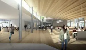 De horeca is centraal geplaatst. Deze verbindt de verschillende gebouwen met elkaar. Ook het park in het noorden en de tuin in het zuiden worden door de horeca aan elkaar gekoppeld. Glooiingen in het landschap zorgen ervoor dat de publieke buitenruimte doorloopt naar binnen en hierdoor met de groene parkengordel van Maastricht verbonden wordt.