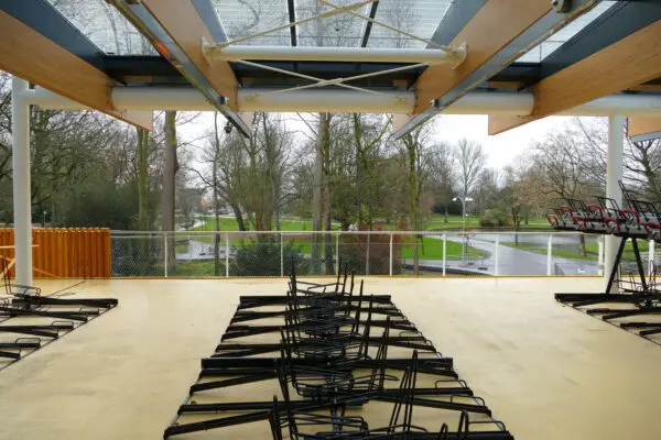 Het architectonisch vocabulaire van een luchtig, open paviljoen past goed op de locatie van het park. De expressieve houten dakspanten versterken de richting van het park naar de treinen en andersom. Op hoog schaalniveau zijn zo beide stadsdelen ten zuiden en noorden van het spoor met elkaar verbonden.