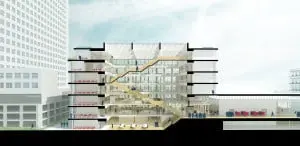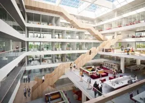 Aan de westkant, waar de Erasmus Universiteit zich bevindt, ontstaat een nieuwe entree. De bestaande studiestraat wordt doorgetrokken tot aan deze ingang. De nieuwbouw opent zich bij binnenkomst via deze entree met een brede podiumtrap. Deze 20 meter brede trap geeft toegang tot het lichte hart van het nieuwe onderwijsgebouw; het atrium. Een monumentale houten trap midden in het atrium verbindt de begane grond met het studielandschap op de zes bovenliggende verdiepingen. Rondom het atrium bevindt zich een flexibel indeelbare ring waar de diverse instructieruimtes en kantoren een plek krijgen.