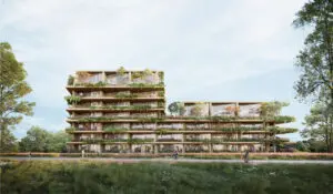 Space&Matter en Onis Vastgoed hebben een tender in Deventer gewonnen met een natuurinclusief woongebouw dat uitkijkt over de IJssel. Het ontwerp – genaamd: ‘de Hangende Tuinen van Zandweerd’ – vormt het slotstuk van een nieuwe zelfbouwwijk van 150 woningen in het noorden van Deventer. Een wijk waar respect voor de natuur en het landschap centraal staan.