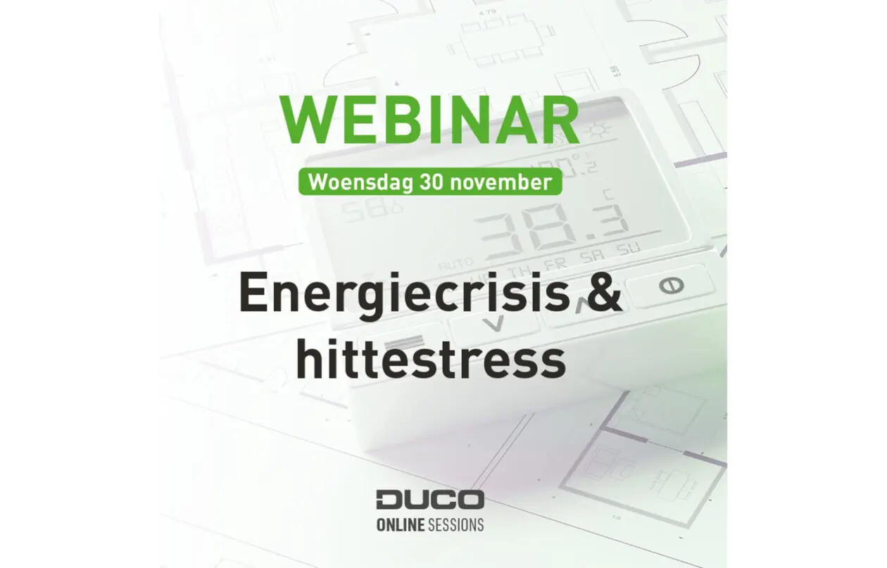 De energiecrisis treft steeds meer huishoudens. De kosten exploderen en gezinnen zoeken naar oplossingen om hun energieverbruik onder controle te houden. Op woensdag 30 november legt DUCO daarom tijdens het webinar Energiecrisis & Hittestress uit hoe hun ventilatie-en zonweringsoplossingen bijdragen tot een comfortabel binnenklimaat op een energiezuinige manier. Adviseur Haico Van Nunen van Bouwhulpgroep schuift mee aan tafel.
