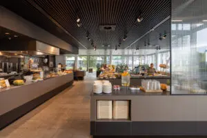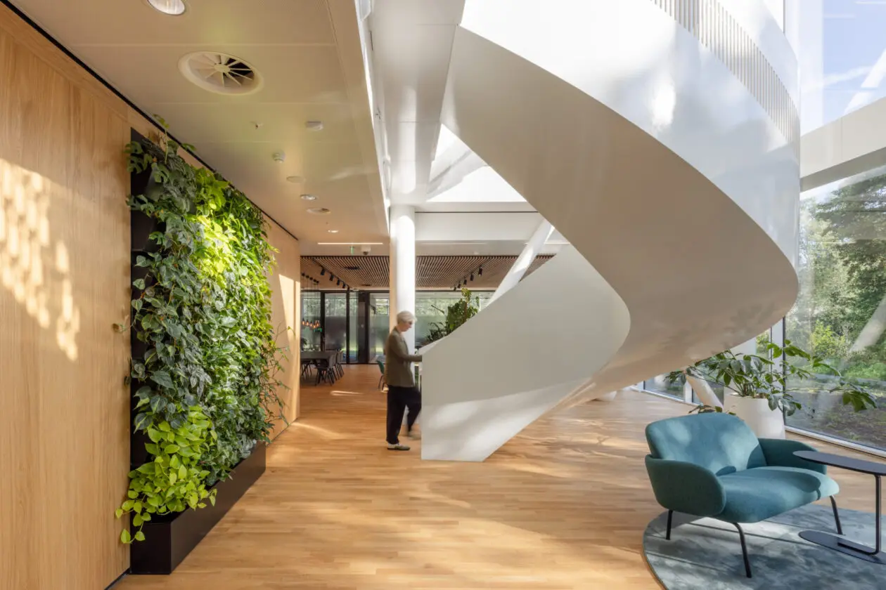 Om het ondernemen en de wetenschappelijke ontwikkelingen te ‘versnellen’ bevinden zich op de begane grond een publiek restaurant, een auditorium voor 250 personen, meet and greet-faciliteiten en vergaderruimtes. De gemeenschappelijke ruimtes van Accelerator ogen elegant door de combinatie van glas, wit gecoat staal, parketvloeren en plafonds van houten latten. Een van de fraaiste details van Accelerator hoort bij de Genmab-verdiepingen: een wenteltrap van dun, wit gecoat plaatstaal. Spectaculair zijn de glazen lift en liftschacht van de toren, met een prachtig uitzicht op de omgeving.