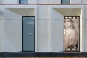 Op de verdieping heeft de gevel een meer gesloten karakter. Hoge, smalle ramen met verdiepte kozijnen geven het pand een klassiek en robuust aanzien. Schuin geplaatste dagkanten, subtiele verschillen in maatvoering van de ramen en terugliggende stenen vlakken vormen een tegengewicht voor de starheid van de traditionelere architectuur en zorgen voor een moderne interpretatie van de klassieke opbouw. Het spannende lichtspel dat hierdoor ontstaat is de bonus voor het winkelende publiek. Het is juist deze aandacht voor materiaal en detail die het winkelpand zijn sterke, eigen identiteit geeft. Met de rijke, eigentijdse detaillering vormt het pand een waardig en karakteristiek onderdeel van het stadsgezicht.