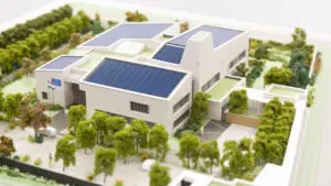 Rond de centrale patio staan drie volumes waarvan elk dak een eigen oriëntatie op de zon heeft, en bedekt is met geïntegreerde PV-panelen. De zonneschoorsteen is gecombineerd met een systeem van natuurlijke ventilatie via het centrale atrium. Om het energieverbruik overdag minimaal te houden – in de zomermaanden is het hier veelal 30° Celcius – wordt gebruik gemaakt van nachtkoeling, gecombineerd met een ventilatie- en koelingssysteem dat kan draaien op een back-up systeem van accu’s.