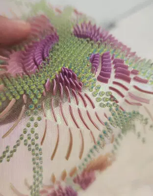 DEOND combineert oosterse behandelmethoden met westerse benaderingen van wetenschap en technologie. Hierdoor voorziet de HUG nieuwe vormen van speculatieve hulpmiddelen die kunnen helpen bij het behandelen van angst en het vertragen van lichaam en geest. Met behulp van Al- en 3D-ontwerptools bootst het kledingstuk natuurlijke vormen na en stimuleert het de triggerpunten in het lichaam. DEOND onderzoekt hoe mensen en het hele ecosysteem hiervan zouden kunnen profiteren als de dualiteit van ‘Body as Machine/Body as Garden’ zou verdwijnen.