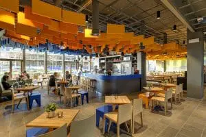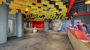 Het pronkstuk in het Meininger hotel Amsterdam City West is de vernieuwde lobby met een kleurrijk plafond met bijna 900 Contour baffles van Rockfon. Architect Christian Sandor Tschersich gebruikte Vincent van Gogh als inspiratiebron voor het parametrisch ontworpen plafond.