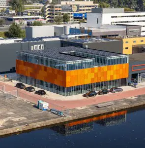“Het was een lastige maar leuke puzzel” zegt Sebastiaan Jansen architect en partner bij KOW. De vraag was simpel: maximaal open maar ook parkeerplaatsen huisvesten op eigen terrein. We hebben onszelf uitgedaagd om nét even anders na te denken bij deze opgave. Door het anders stapelen van functies ontstond maximale transparantie en openheid op maaiveld. Hierdoor is het parkeren en de opslag naar de 1e verdieping verhuisd. Middels een hellingbaan komen de auto’s op een afgeschermd parkeerdek. Op de tweede verdieping is kantoorruimte gerealiseerd rondom een dakterras met uitzicht over de naastgelegen haven en de Amsterdam Arena.