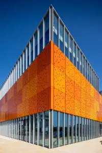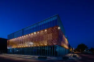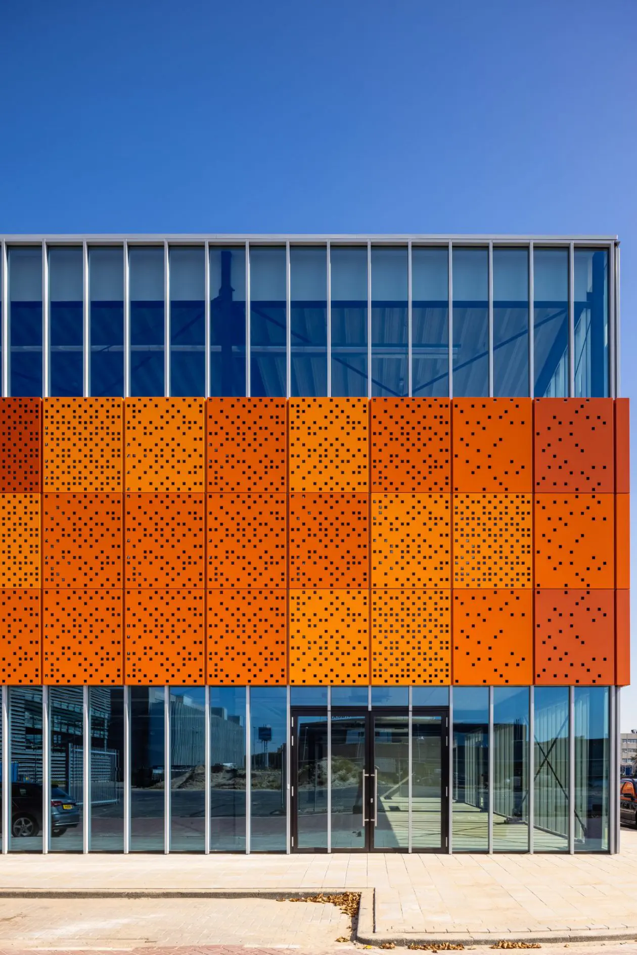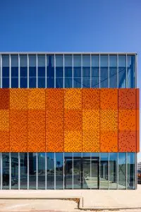 De architectuur straalt kracht en eenvoud uit, met open- en gesloten vlakken. Door de gevel van middelste laag uit te voeren in geperforeerd staal krijgt het gebouw steeds een nieuwe aanblik. ‘s Nachts fungeert het als een lantaarn met honderden gaatjes, overdag ventileert de gevel het parkeerdek.