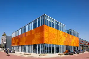 Aan de Pieter Braaijweg langs de ring van Amsterdam heeft KOW Architecten voor schilder -en-onderhoudsbedrijf Fred Noom & Zn een nieuw flexibel bedrijfsgebouw ontworpen van twee verdiepingen. De gevel uitgevoerd in geperforeerd staal ventileert het parkeerdek op de 1e verdieping.