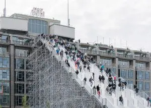 Een gigantische trap – 29 meter hoog en 57 meter lang – leidt tussen 16 mei en 12 juni vanaf het Stationsplein naar het dak van het Groothandelsgebouw in Rotterdam. De steigerinstallatie, naar een idee van architectenbureau MVRDV, is een knipoog naar 75 jaar wederopbouw van de stad, dat dit jaar wordt gevierd met de manifestatie Rotterdam viert de stad!
