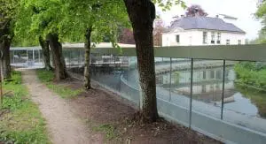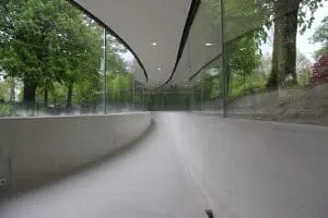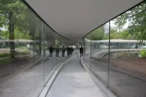 Architect Marieke Kums van Studio Maks ontwierp een min of meer driehoekig paviljoen voor Park Vijversburg in Friesland. Een draagconstructie ontbreekt. De glazen gevels fungeren als dragers van het dak. Senior adviseur Han Krijgsman van ABT liet zich bij de uitwerking van de glasconstructie inspireren door het principe van de glazen balustrades die aan de onderzijde worden ingeklemd. Krijgsman: ‘Dit is nog niet eerder vertoond, maar we moesten wel eerst een mentale drempel over.