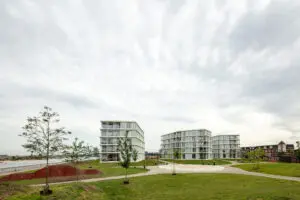 De gebouwentrees bevinden zich op begane grond niveau en zijn bereikbaar vanuit het park en via bruggen over de groene gracht aan de oostzijde. Verder tellen de paviljoens vijf bouwlagen boven maaiveld die op de bovenste twee verdiepingen iets terugtrappen. Een compacte kern geeft toegang aan drie appartementen per laag en twee penthouses op de bovenste verdieping. De daken zijn voorzien van groen en pv-panelen.