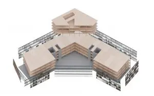 De modulaire gevel zal transparant zijn waar het kan en gesloten waar dit nodig is. Bovenlichten zorgen voor daglicht op werkplekken waar privacy noodzakelijk is. Houten lamellen filteren licht, bieden bescherming tegen directe inkijk en zorgen voor beveiliging bij te openen delen. Met deze visie voor het gevelontwerp brengen we de kleine schaal van de binnenstad terug in het gebouw. Hierdoor komt het in verbinding te staan met de omgeving en de samenleving.