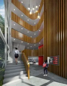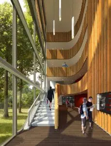 Speciale aandacht is uitgegaan naar de vormgeving van het hoofdtrappenhuis. Deze heeft een directe visuele verbinding met het station, maar moet bij binnenkomst ook een welkomsgevoel geven. De hal refereert naar de verschillende landhuizen in de omgeving, die vaak van een grote doorgaande bordestrap voorzien zijn. Het karakteristieke spel van houten lamellen is doorgetrokken in het interieur. De entree is overzichtelijk en transparant.