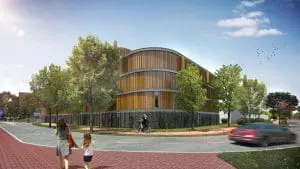 Om de voetgangersentree te verduidelijken is deze losgeplaatst en heeft een optopping gekregen. Ook de in- en uitrit is dankzij een inham in het volume een logische, bereikbare en zichtbare plek. Aan de Odijkerweg heeft het gebouw juist een setback om beter aan te sluiten bij de woonstraat. Vanaf hier loopt de massa trapsgewijs op wat versterkt wordt door de oplopende plint.