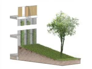 De parkeergarage is opgebouwd uit duurzame onderhoudsarme materialen die op een natuurlijk manier verouderen, zonder afbreuk te doen aan de esthetische kwaliteit. In het ontwerp zijn twee gevelconcepten verenigd. De plint is uitgevoerd met schanskorven en gaashek met begroeiing. Het overige deel is uitgevoerd in lariks lamellen. De houten delen worden op diverse plekken afgewisseld met smalle glasruiten, waarbij aan de buitenzijde openstaande luiken zijn gepositioneerd, om de schaal van het gebouw te breken. Een belangrijke energie- en kostenbesparing is bereikt middels natuurlijke ventilatie van de parkeergarage. De resterende energievraag wordt middels zonnepanelen op het dak opgewekt.