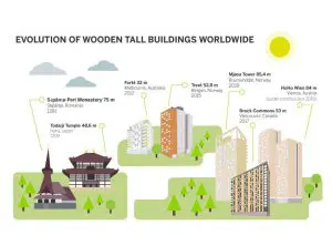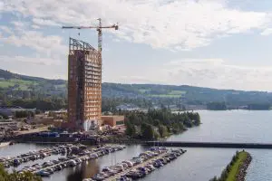 Het hoogste houten gebouw ter wereld is geopend. De Mjøstårnet gelegen in Brumunddal in Noorwegen, heeft 18 verdiepingen en is 85,4 meter hoog. Het gebouw bevat een hotel, appartementen en kantoorruimten.