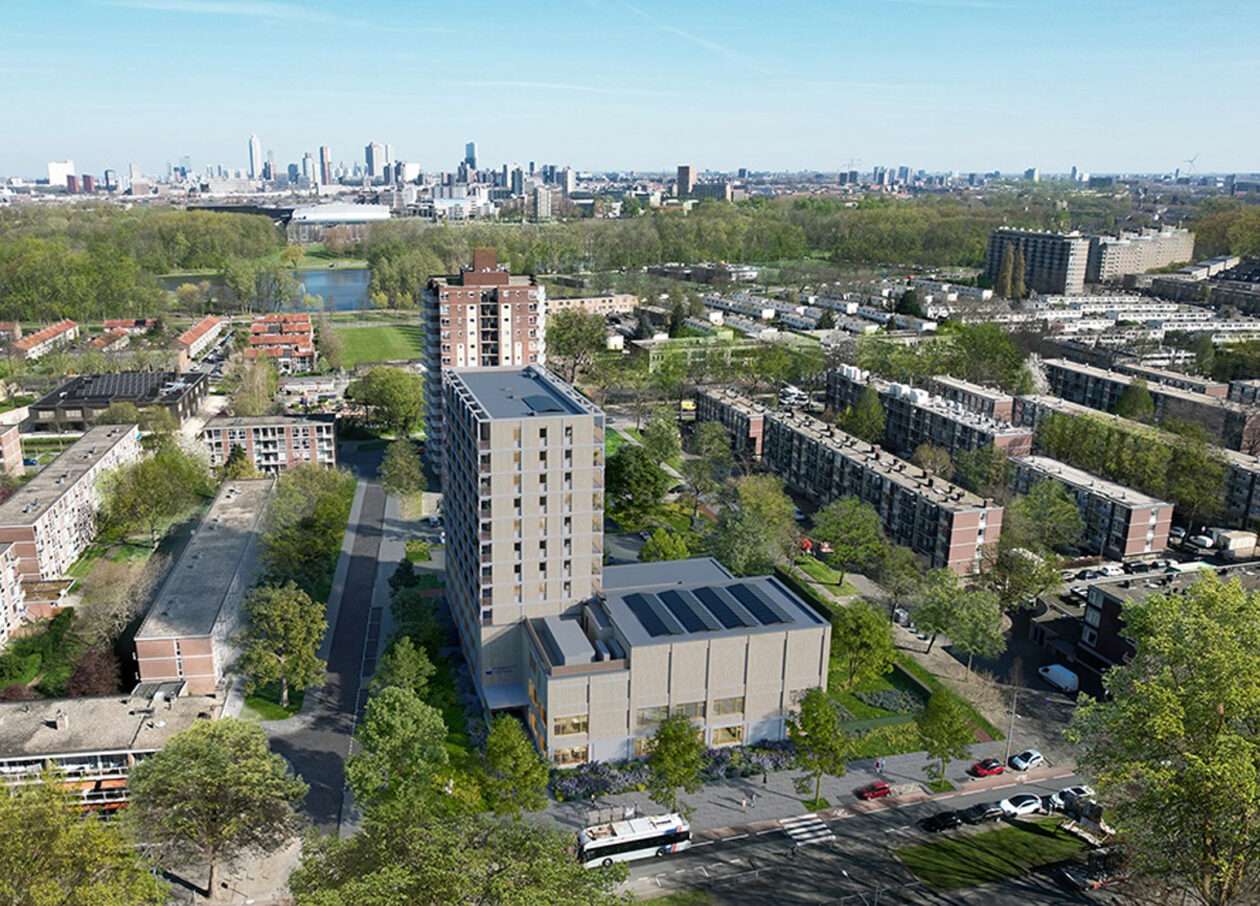 KAW heeft een hybride gebouw ontworpen met 53 appartementen en een basisschool. Het grote Rotterdamse stadsblok krijgt een vriendelijke uitstraling door de groene baksteen, de zachte plint, de grote ramen, speelse hoekjes en de glijbaan naar buiten.