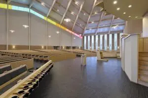 De plattegrond is symmetrisch ontworpen over een oost-west georiënteerde middenas. Naar het oosten toe loopt het grondplan vliegervormig uit. Op de begane grond bevinden zich de kerkzaal, met consistoriekamer, een bibliotheek en twee grote zalen. Eén van deze zalen kan worden gebruikt als rouwcentrum. Op de eerste verdieping zijn nog eens zes zalen ondergebracht voor catechisatie en jeugdwerk.