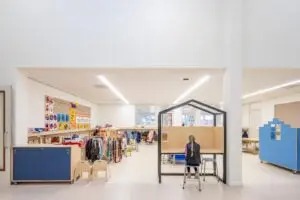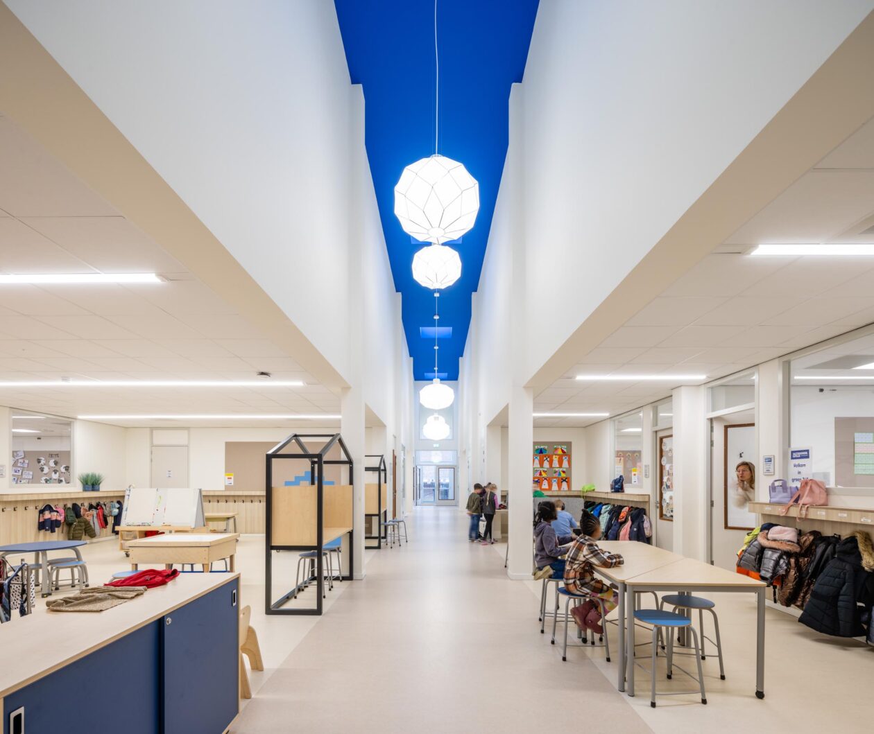 De lokaalzones aan de buitenkant zijn licht en uniform ontworpen en liggen aan multifunctionele leerpleinen. In deze dynamische, speelse ruimten kunnen leerlingen van de verschillende scholen elkaar vanzelfsprekend ontmoeten.