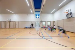 De sport-, kinderopvang-, jeugdzorg- en onderwijsinstanties in het kindcentrum hebben elk hun eigen domein. De hal zorgt voor een gemakkelijke oriëntatie: aan het begin ligt de entree en aan het einde de grote sportzaal die uitzicht biedt op de hal. De centrale hallen aan de uiteinden zijn hoog met daartussenin een verlaagd deel, dat zo een meer intieme uitstraling heeft. Door het verhoogde centrale dak valt een overvloed aan daglicht de hal binnen.