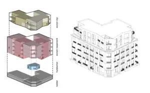 Het gebouw biedt ruimte aan een uiteenlopend programma aan woningtypen; 24 appartementen van wisselende afmetingen. Deze configuratie was het resultaat van een uitgebreide studie naar de oppervlakte-verdeling en kon worden opgelost door te ontsluiten middels een wokkeltrap. In het basement bevinden zich het merendeel van de woningen: compact van opzet en met een ruime loggia die uitkijkt op het park. Daarboven bevinden zich de appartementen uit het hogere segment die middels lange zichtlijnen het contact leggen met de stad. Het woonprogramma wordt aangevuld met een gezamenlijke ruimte naast de entree: een collectieve multifunctionele ruimte verbonden met het park.