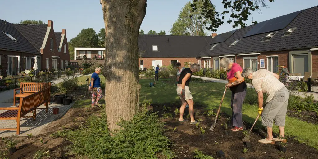 Er is een scala aan nieuwe woonvormen waarbij senioren wel zelfstandig wonen, maar toch voorzieningen met elkaar delen. Een Knarrenhofje, zoals in Zwolle ontworpen door Inbo architecten, is een interessant voorbeeld. Dit concept kan met grondgebonden hofjeswoningen, maar ook in gestapelde vorm gerealiseerd worden, met een gezamenlijke tuin of terras.