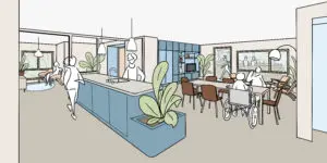 Studio Komma ontwikkelde in een intensief proces met de gebruikers een bijzonder plattegrondprincipe voor de woongebouwen. In het plan is gekozen voor brede gangzones waardoor de gangen leefkwaliteit krijgen en een verlengde worden van de woonkamers. Door de woonkamers een centrale plek in de plattegrond te geven, verkort de architect de zichtlijnen en is ook de personele bezetting efficiënt in te vullen.