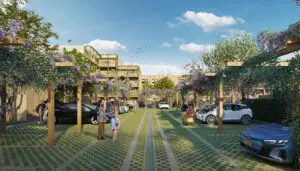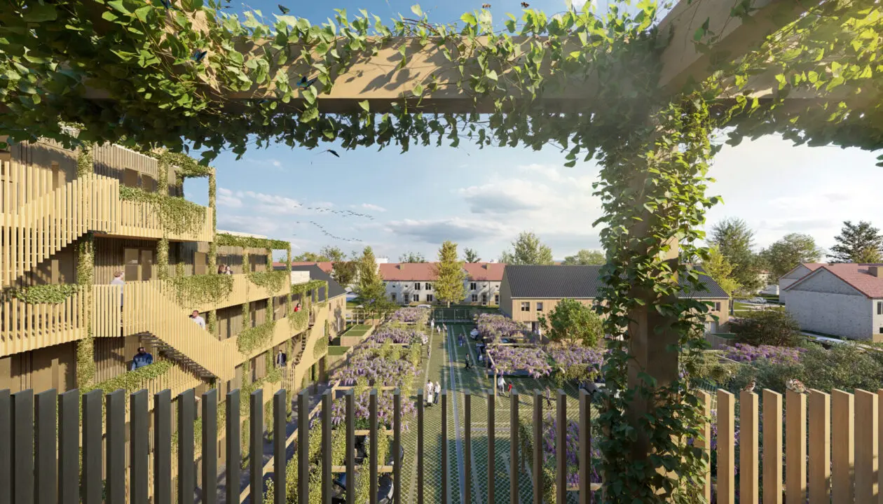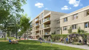 Het toegepaste materialenpalet omvat naast zandkleurige baksteen ook houten accenten en groene ruimtes, waardoor elk woonblok een gemêleerd geheel vormt met warme en natuurlijke materialen. In de binnenhoven wordt volledig ingezet op hout en vergroening, met pergola’s en houten gevels die bijdragen aan een aangename sfeer van verkoeling en vergroening.