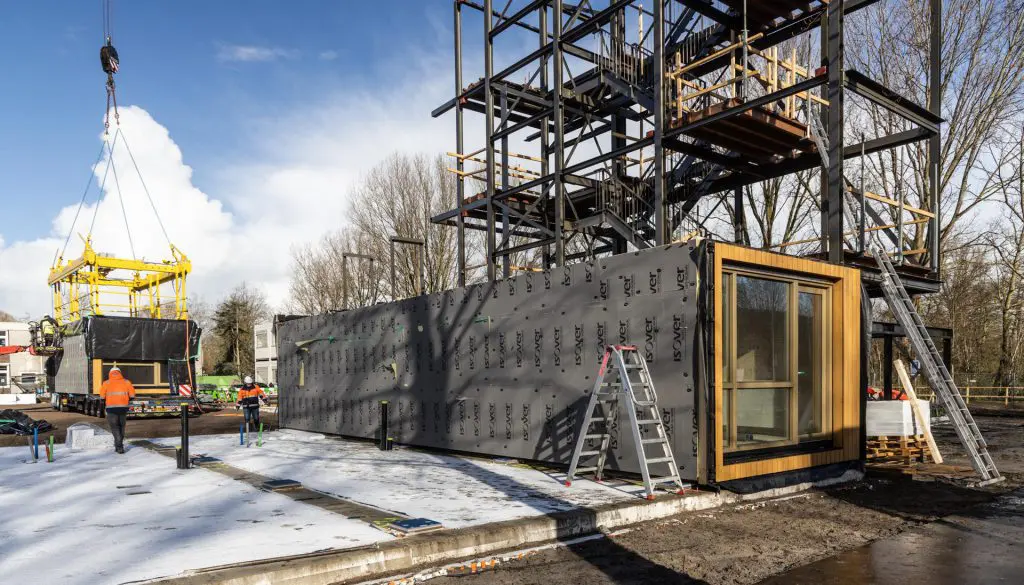Voor alle 62 appartementen wordt een compleet bouwproces in de twee grote productiehallen van de fabriek van De Groot Vroomshoop doorlopen. In de eerste fase van de productielijn worden de woningen samengesteld met als resultaat een nagenoeg complete woning inclusief badkamer. In de vervolgstappen worden de voorzieningen zoals elektra, installaties, vloerlagen en binnendeuren ingebouwd en worden de woningen voorzien van dakbedekking. De laatste fase van de prefabricage bestaat uit het monteren van de galerijen en balkons.